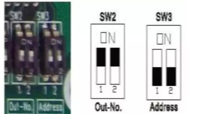 地址碼(Address)為1號(hào),也就是兩位撥碼開關(guān)不動(dòng),撥碼位置是“ON、ON”方向,數(shù)量碼(Out)為3臺(tái),兩位撥碼開關(guān)為“ON、OFF”,轉(zhuǎn)接碼和地址碼一樣。
