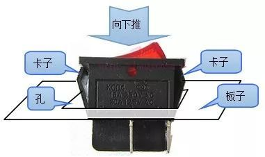 安裝的時候,船型開關兩側面有兩個開口卡子,將開關對準板子上的孔向下推,等待卡子將開關固定在板子上即可。